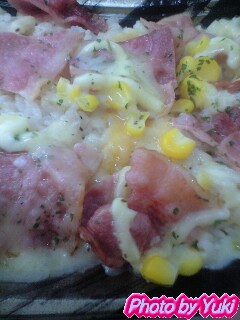 3人で休憩室で食事。ベーコンチーズライスです。コーンもありますね。あと黒コショウがはいってます。…これ、十分作れそうです。味は結構美味しかったですよ♪。